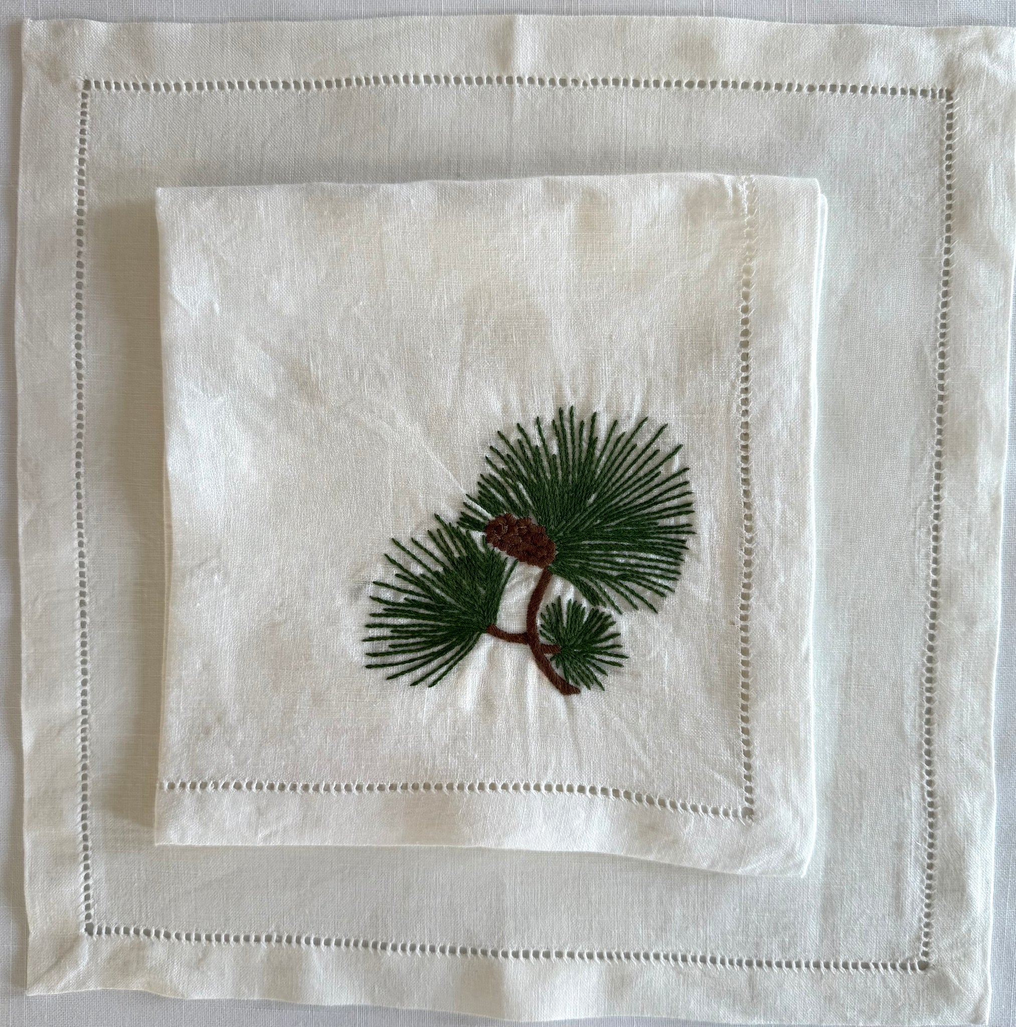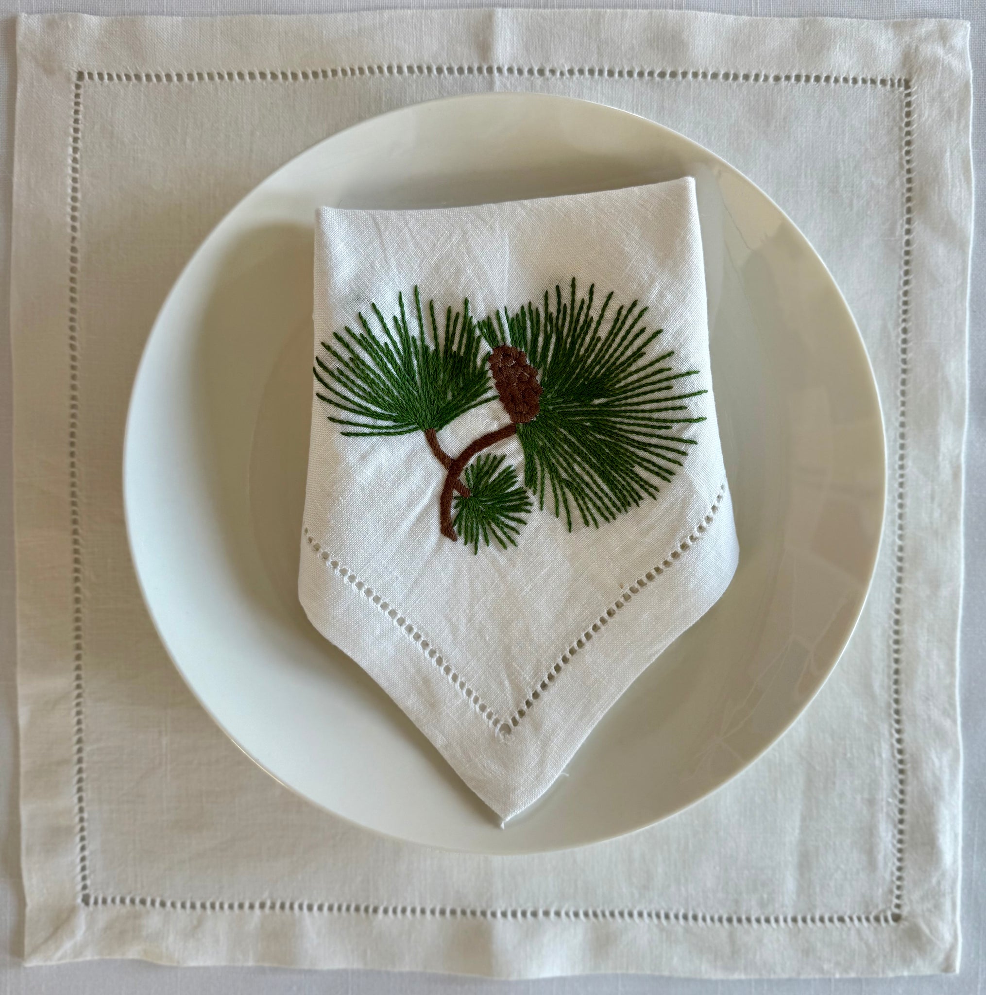 These Fir pinecone napkins are all hand stitched. These are made out of white linen and embroidered with a cotton thread. Gentle wash and tumble dry on low heat or lay flat to dry is recommended.