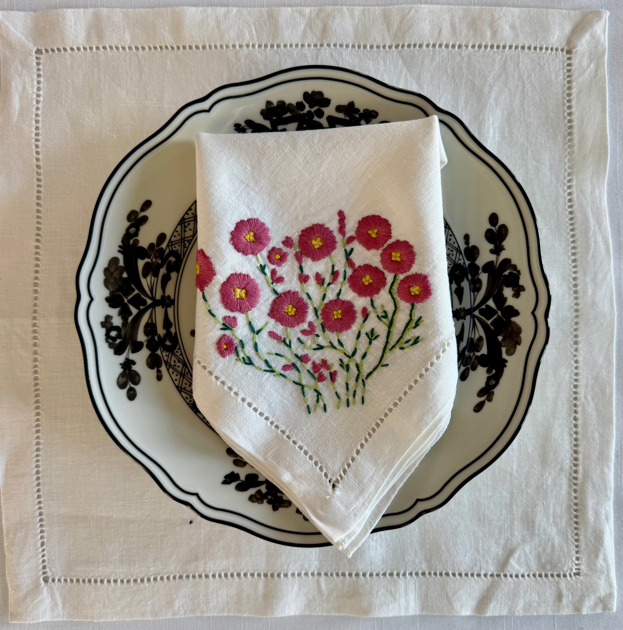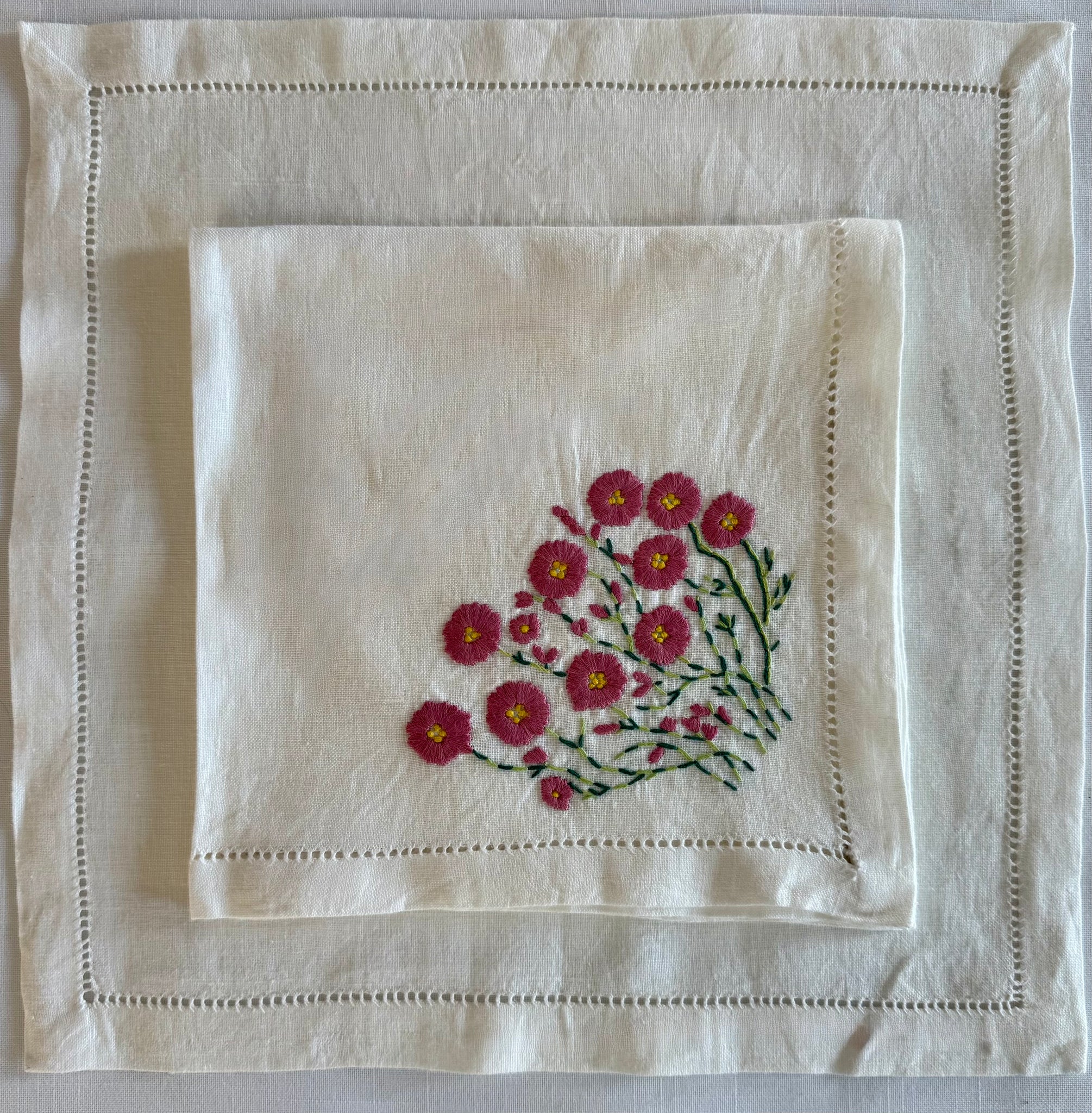 Pink Day Floral napkins are all hand stitched. These are made out of white linen and embroidered with a cotton thread. Gentle wash and tumble dry on low heat or lay flat to dry is recommended.